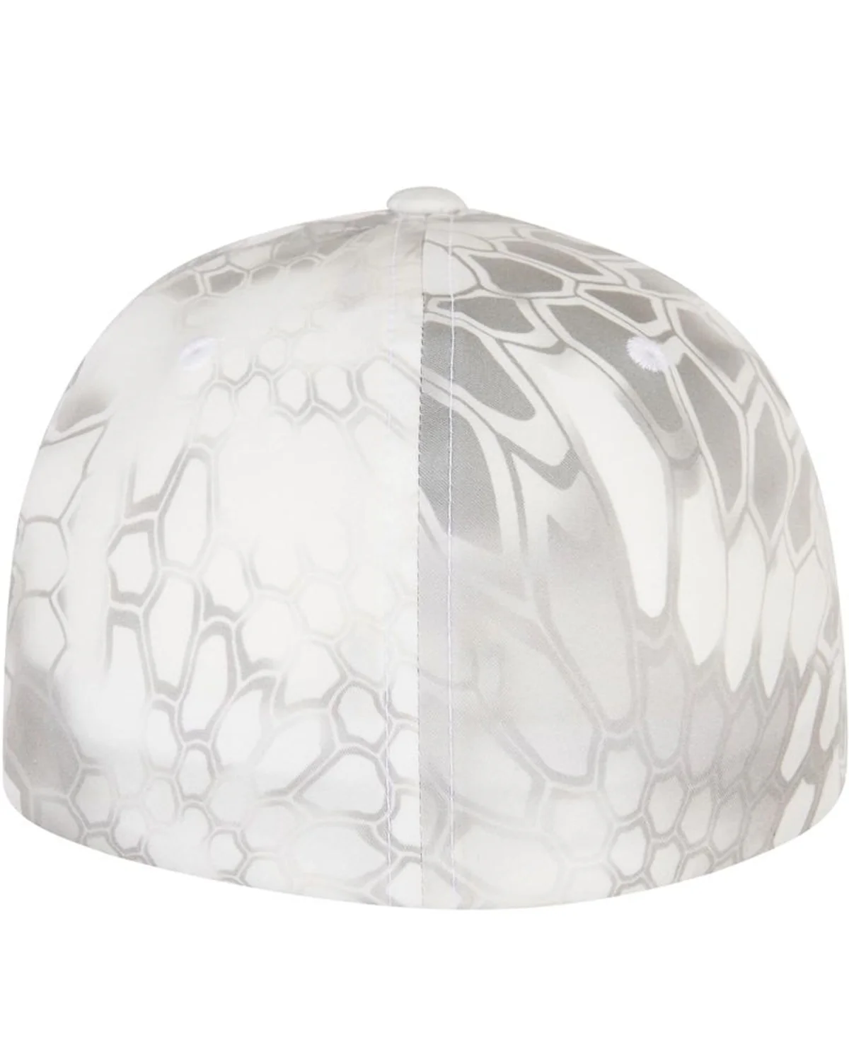 Valkoinen flexfit lippalakki modernilla Kryptek-kuviolla. Lippiksessä on joustava sisänauha, joka mukautuu automaattisesti pään koon mukaan.